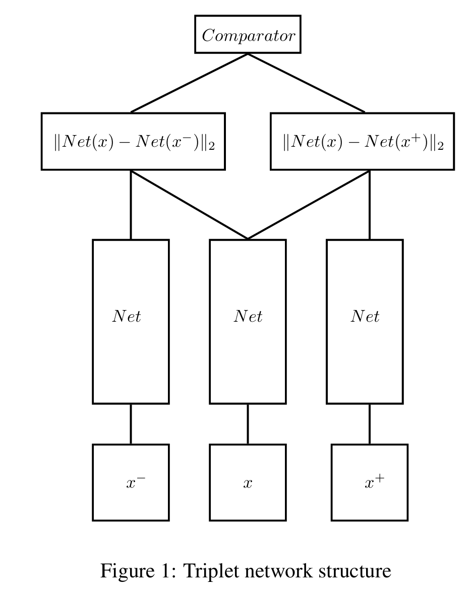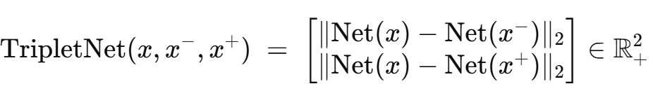 트리플릿 네트워크(Triplet Network)는 Siamese network에서 영감을 받아 동일한 구조와 파라미터를 공유하는 feed forward network 3개로 이루어진다. 3개의 샘플 x(앵커), x+(양성), x−(음성)을 동시에 입력하면, 네트워크는 두 개의 L2 거리를 중간층에서 산출한다. 각 행은 기준 x와 다른 두 샘플 사이의 임베딩 거리 한 쌍을 담는다.