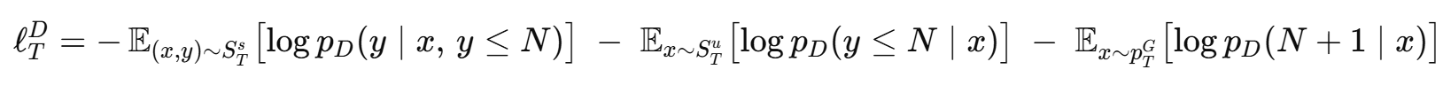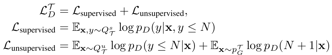 분류기 손실은 지도학습 손실과 비지도학습 손실을 결합하여 구한다. Lunsupervised에서 첫 항은 QTu가 real 클래스(1~N)로 예측되도록 유도하고, 둘째 항은 생성기가 만든 샘플이 fake 클래스(N+1)로 예측되도록 유도한다.
