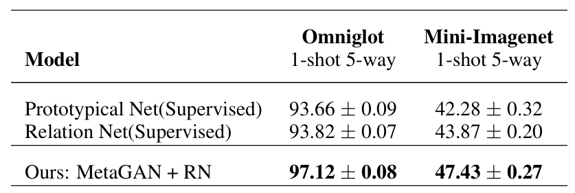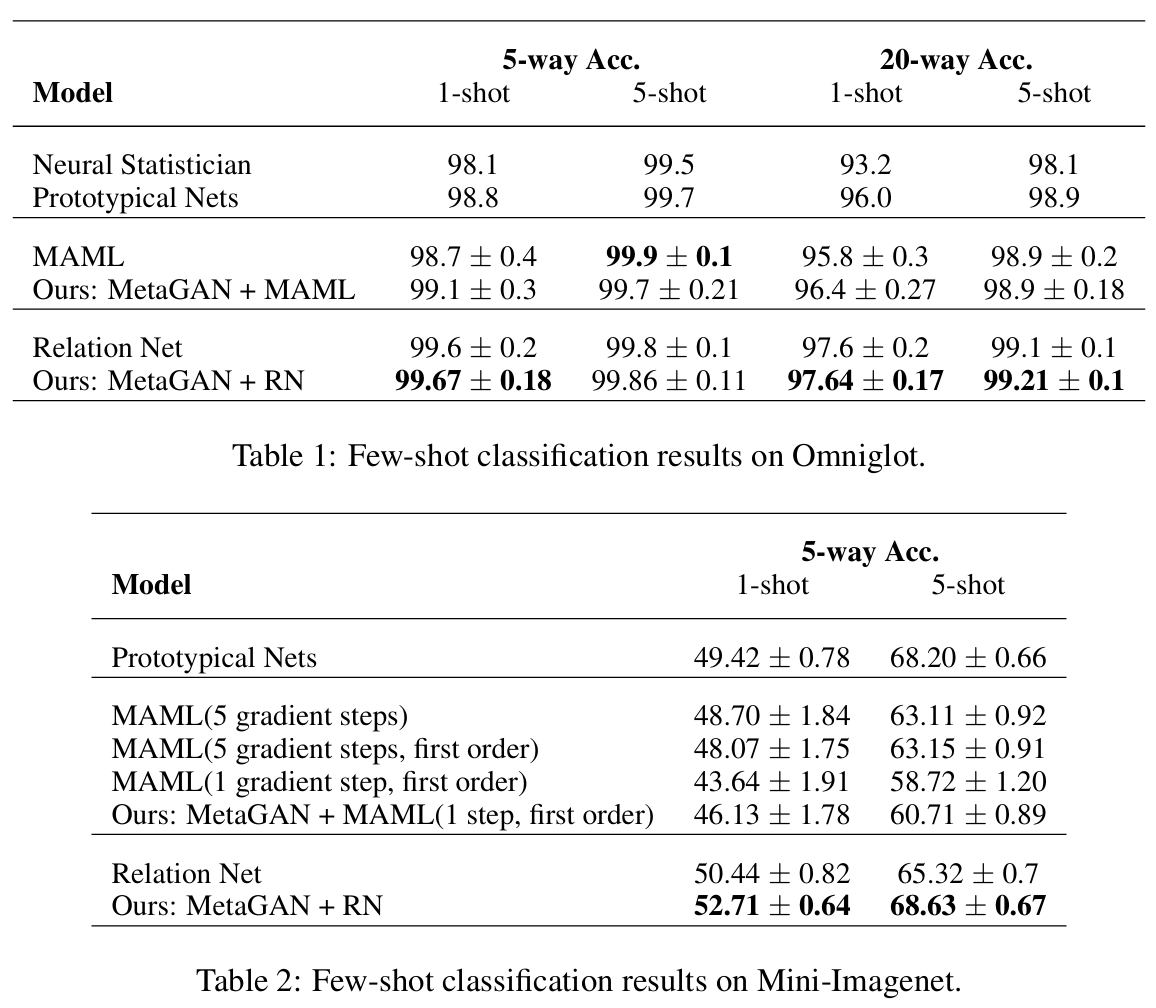 제안한 MetaGAN이 모든 설정에서 베이스라인 분류기를 일관되게 능가했다. 특히 어려운 Mini-Imagenet 벤치마크에서도 최첨단 성능과 대등하거나 더 우수한 결과를 달성했다.