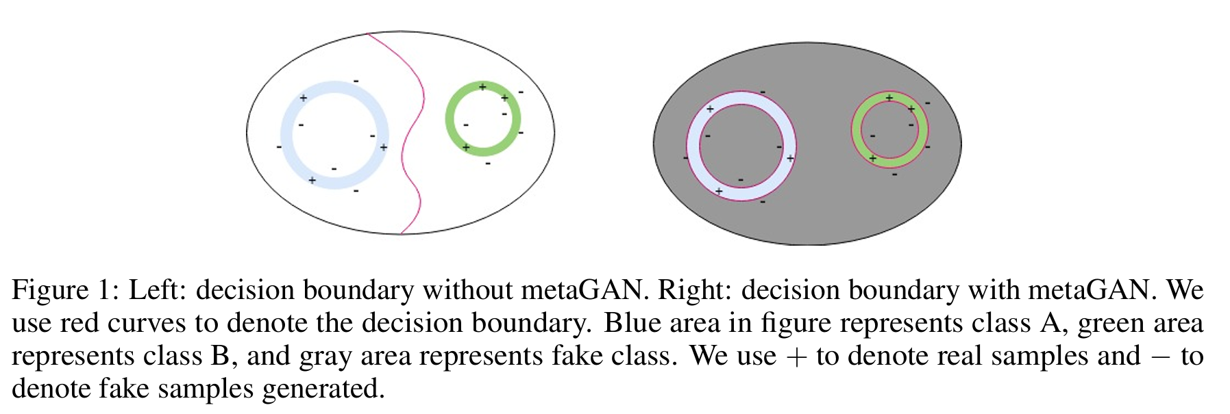 MetaGAN의 핵심 아이디어는 불완전한 generator가 실제 클래스 매니폴드 사이에 fake 샘플을 생성하여 discriminator에 추가적인 학습 신호를 제공함으로써, 더 날카로운 결정 경계를 학습하도록 만드는 것이다. 이로써 소수의 샘플만으로도 더욱 일반화 가능한 경계를 형성할 수 있다.