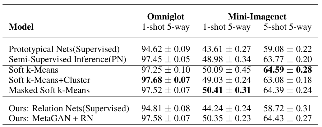 마지막으로, 지도 및 준지도 설정에서 도전적인 few-shot 이미지 분류 벤치마크를 통해 MetaGAN을 검증하였다. 대표적 few-shot 모델인 MAML과 Relation Network에 MetaGAN을 결합했을 때, 모든 시나리오에서 성능이 일관되게 향상됨을 보여준다.