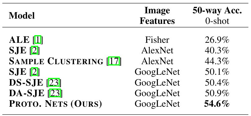동일한 아이디어를 zero-shot learning에도 확장하여, 클래스 별 메타데이터를 별도 임베딩하여 프로토타입으로 사용한다.