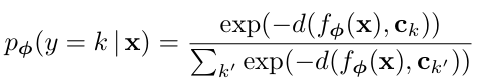 거리 함수(d)가 주어지면 쿼리 점 x에 대한 클래스 확률 분포는 각 프로토타입과의 거리를 소프트맥스에 적용하여 계산한다.