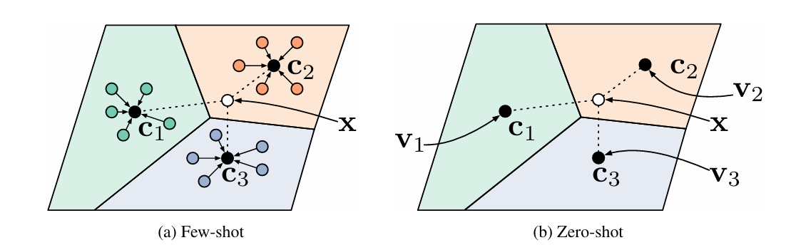 zero-shot 학습은 few-shot 학습과는 달리, 훈련 샘플의 support set이 주어지는 대신 각 클래스에 대해 클래스 meta-data 벡터 vk가 제공된다는 점에서 차이가 있다. meta-data 벡터들은 사전에 결정될 수도 있고, raw text로부터 학습될 수도 있다. 우리는 이 meta-data 벡터 vk를 또다른 임베딩 함수 gθ로 표현 공간에 매핑하여 프로토타입 ck=gθ(vk)을 생성한다. meta-data 벡터와 query 포인트가 서로 다른 함수에서 오는데, 경험적으로 프로토타입 임베딩 g의 출력을 정규화하여 단위 길이로 고정하는 것이 도움이 되었다.