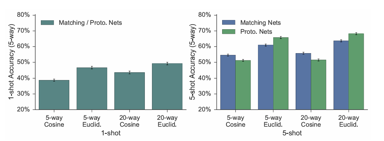 추가 분석으로 metric 선택과 에피소드당 훈련 클래스 수가 Prototypical Networks와 Matching Networks 성능에 미치는 영향을 조사했다. Prototypical Networks와 동일한 임베딩 아키텍처를 사용하는 Matching Networks 구현체를 자체적으로 작성했다.