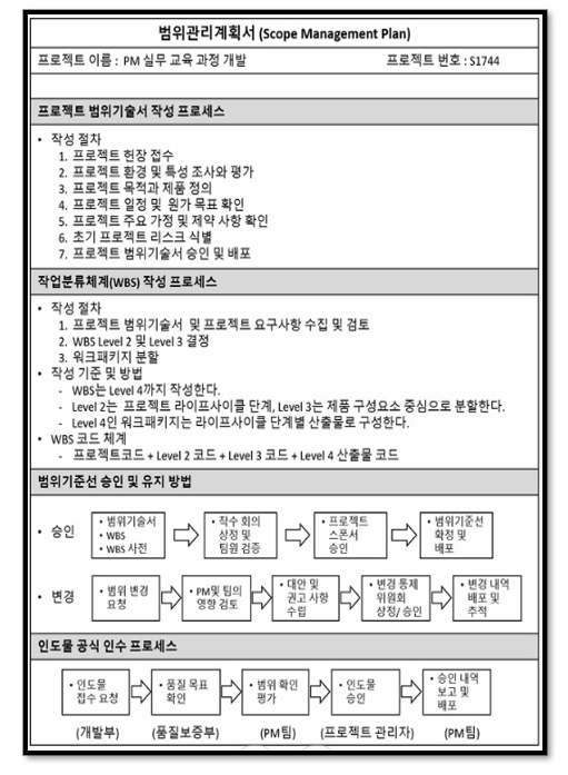 범위 관리는 프로젝트의 성공을 위해 모든 작업을 포함하도록 하는 지식 영역이다. 프로젝트가 어떠한 목적을 위해 어떠한 작업이 필요한지에 대한 범위 설정을 함으로써 무엇을 포함하고 무엇을 배제할 것인지에 대해 결정하는 영역이다.