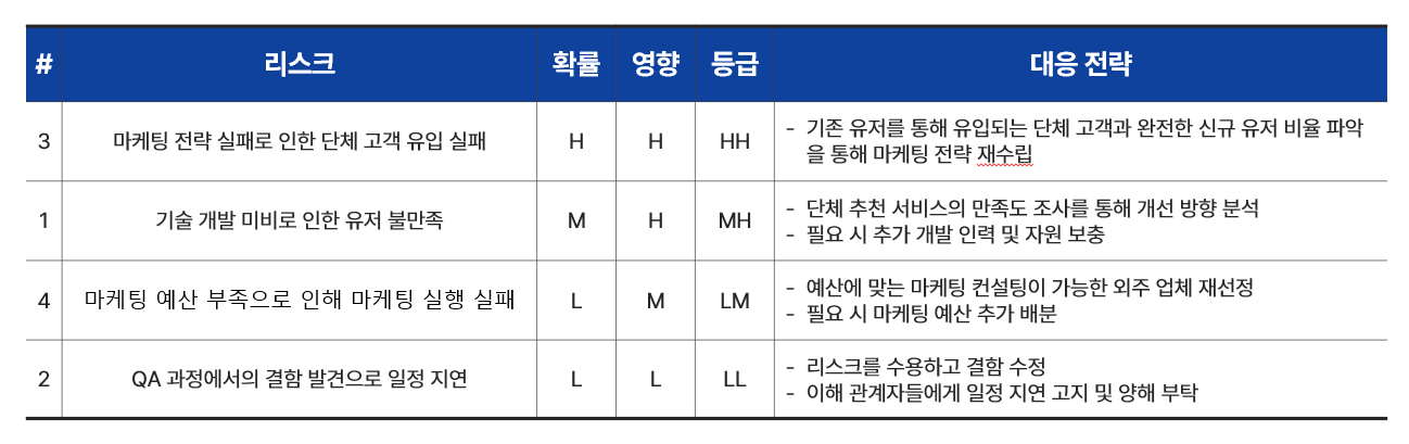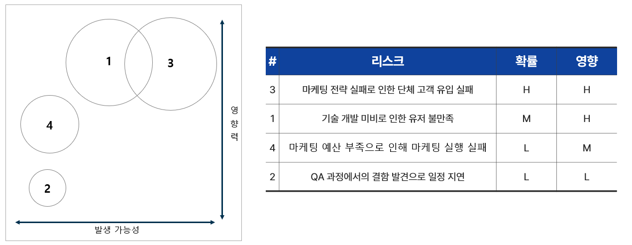 프로젝트 계획 시 어떠한 리스크가 어떠한 확률로 일어날지 그리고 얼만큼의 영향이 있을지에 대한 Probabiltiy & Impact Matrix를 작성한다.