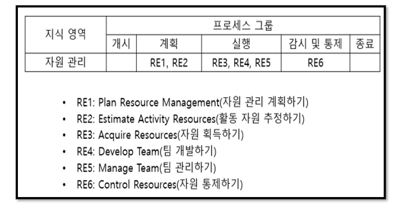 프로젝트에 필요한 자원들을 확인, 획득, 관리하는 프로세스들을 포함. 인적 자원과 물리적 자원이 대표적인 자원의 예시이다.