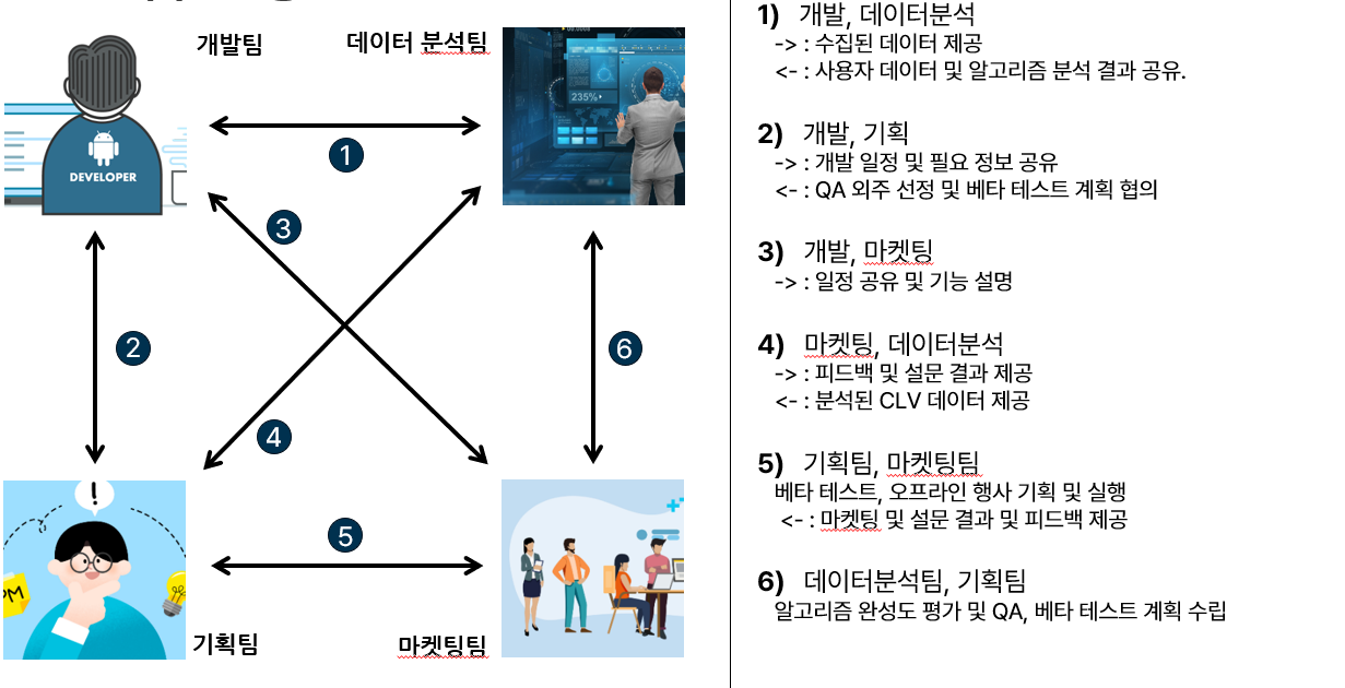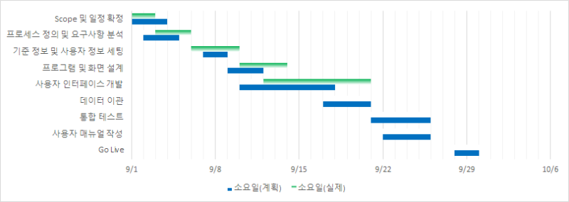 프로젝트 착수: 프로젝트 목적, 범위, 목표, 제약 사항, 리스크 등을 정의하고 프로젝트 팀을 구성한다.