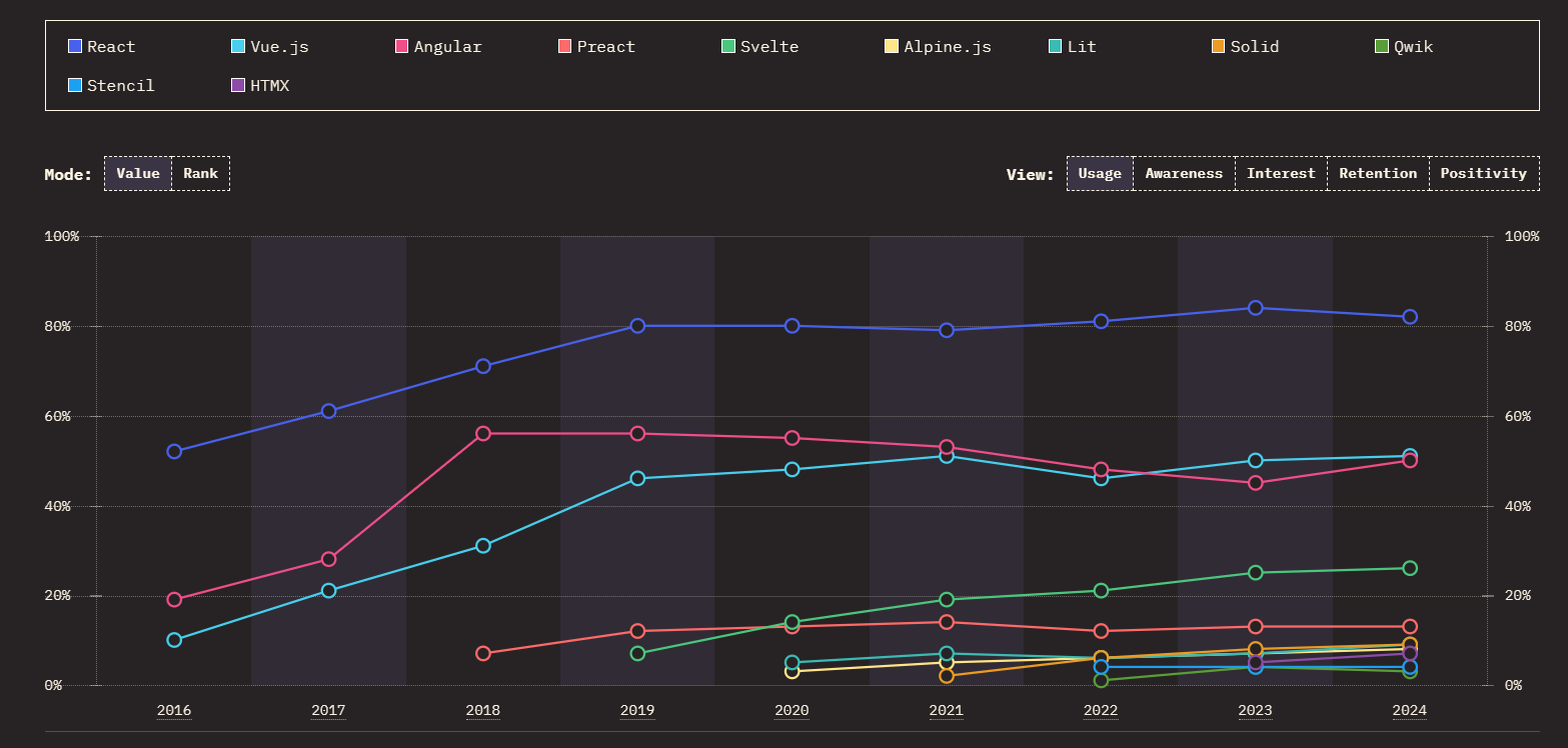 Facebook이 개발한 React는 2013년에 출시되었으며, Facebook은 React를 자사의 제품(Facebook, Instagram 및 WhatsApp)에서 광범위하게 사용하며, 전 세계적으로 가장 많이 사용되는 프론트엔드 프레임워크입니다.