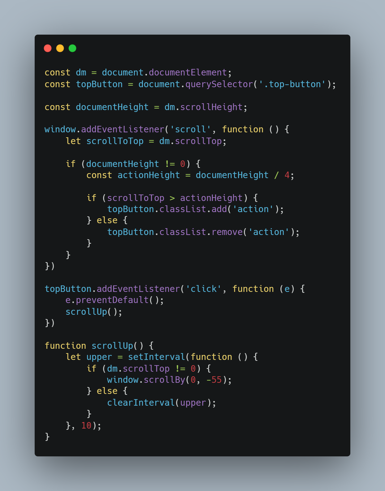 - 자연스럽게 올라가기 위해서는 짧은 시간 반복해서 계속 스크롤 값을 빼줘야 하기 때문에 일정 시간 후 한번 반복하는 .setTimeout 함수 보다는 .setInterval 함수가 적합해서 .setInterval 함수를 사용 하였다.