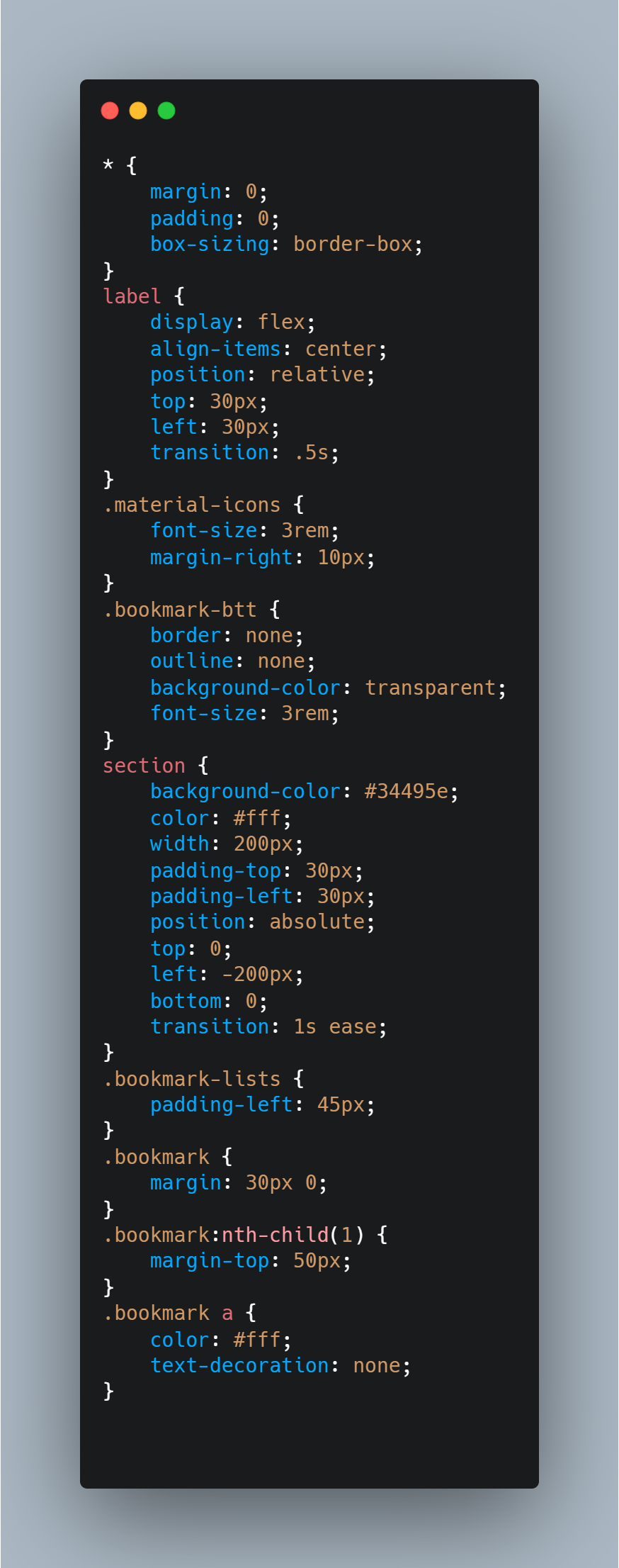 - [css] position 속성을 이용해 사이드바에 left: -200px 을 주어 화면 밖 왼쪽에 숨겨둔다.
