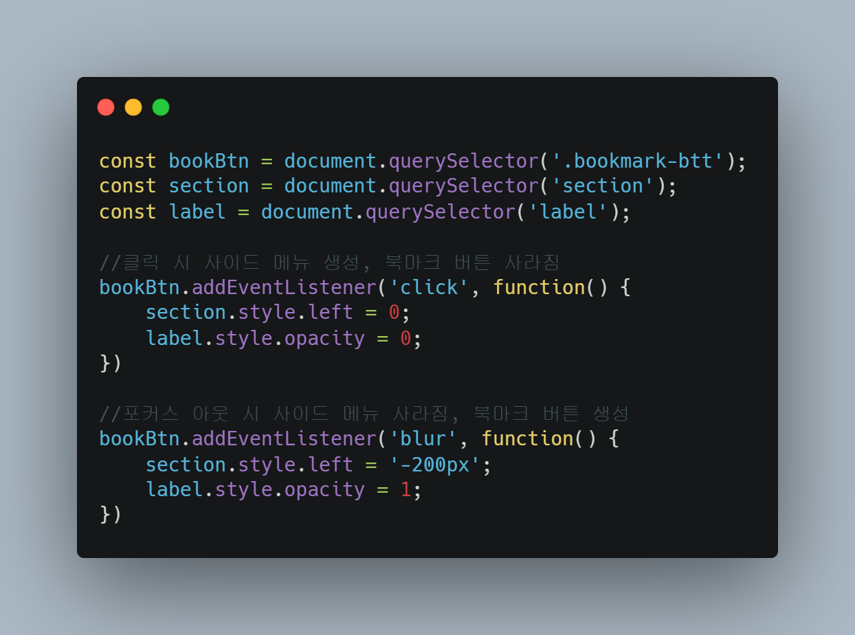 - [javascript] 이벤트 함수 'blur'을 통해 '포커스 아웃'시 사이드바 position에 다시 left: -200px 을 주어 화면 밖 왼쪽으로 숨기고 메뉴 버튼이 다시 보여야 하므로 opacity 값을 1을 주어 다시 보이게 한다.