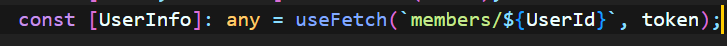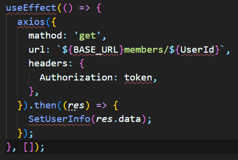 React의 custom Hook을 활용해서 만든 useFetch hook이다. get요청을 보내게 될 url의 쿼리값이 각 페이지마다 다르기 때문에 인자로 url,id값을 받게 되고, state값의 경우 렌더링 에러 방지 차원으로 받게 되는 상태관리용 값이다. token같은 경우 마이페이지를 조회 할 때에 사용해야 하기 때문에 인자로 넣어 주었다.