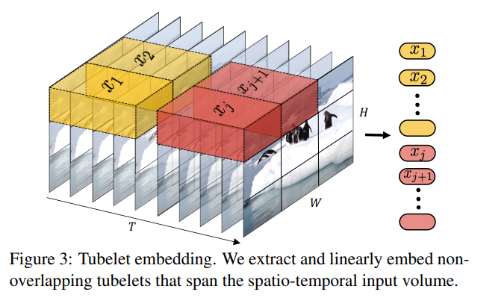 - 입력 영상을 Tublet(작은튜브)로 쪼갠 후, token으로 변환하여 Transformer에 입력하는 방식