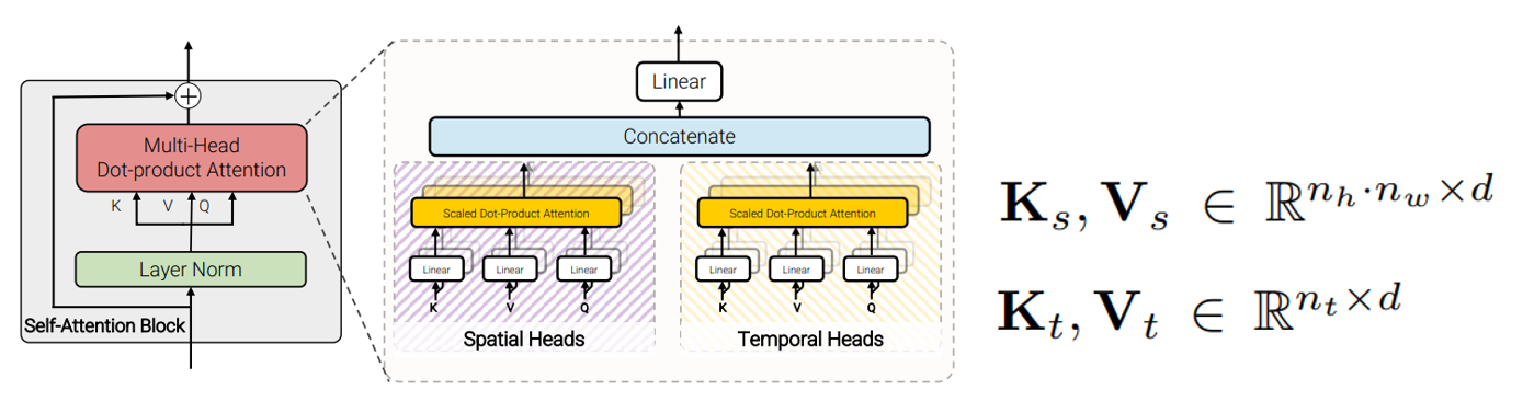 - Q,K,V 생성 후 Self-Attention시 head를 반으로 나눠 한쪽은 Spatial만 한쪽은 Temporal만 처리