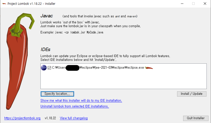 Eclipse에서 Lombok이 제대로 동작 하지 않는다면 따로 설치가 필요하다 https://projectlombok.org/download