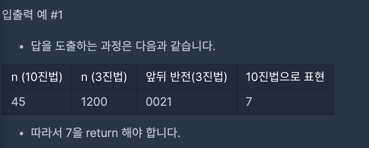 자연수 n이 매개변수로 주어집니다. n을 3진법 상에서 앞뒤로 뒤집은 후, 이를 다시 10진법으로 표현한 수를 return 하도록 solution 함수를 완성해주세요.