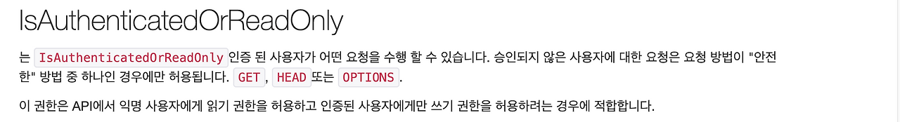 이걸 사용하면 GET은 read_only로, 그 외 CREATE, PUT, DELETE는 로그인 승인이 필요한 상태로 view함수를 데코레이팅 할 수 있을 것 같다!!