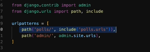 polls 이하의 주소들은 polls.urls로 들어감.