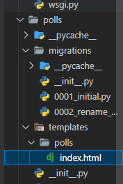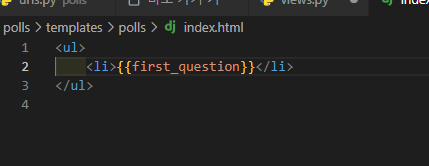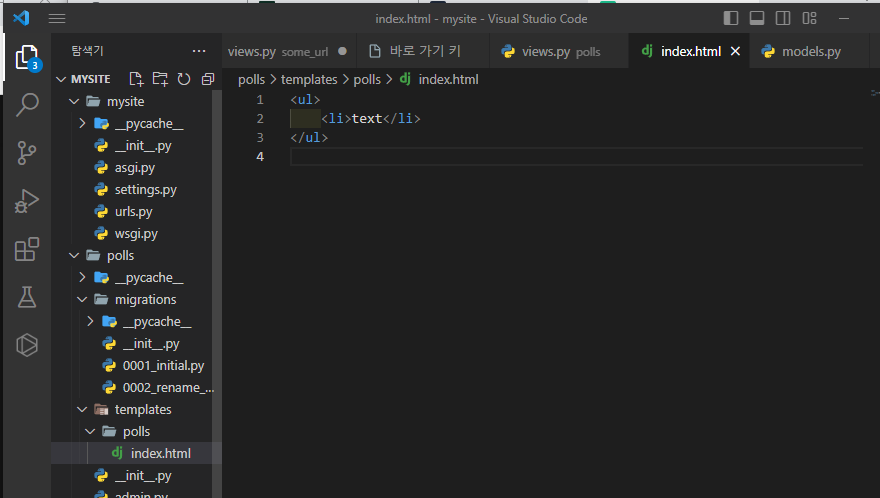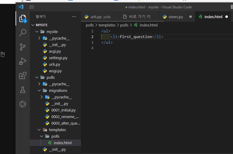 탬플릿을 만들기 위해, polls 폴더 내에 templates/polls 폴더를 생성. 안에 index.html을 만들어준다.