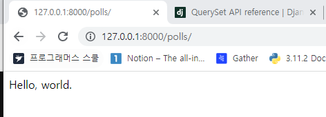 polls 앱은 전체 프로젝트 경로에서는 polls 아래로 들어옴. 이는 전체의 url.py를 보면 알 수 있음.