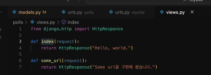 polls의 url.py에선 polls이하 아무것도 들어오지 않을경우, views.index으로 넘김