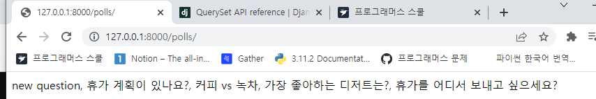 이 리스트에서 반복문을 돎련서 q.question_text만 모음. 이걸 , 으로 join 함.