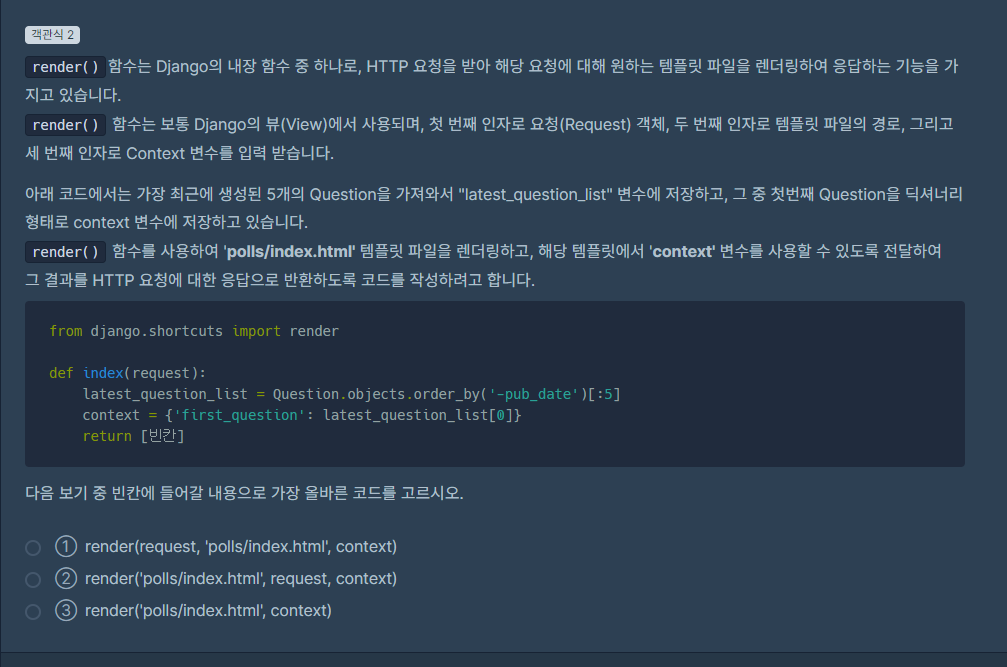 render 함수는 요청값, 그려줄 html, html에 전달한 변수를 사용하여. 그려줄 html에서 views에서 전달받은 변수를 이용하여, 출력하고, render는 그 그려진 html을 받아 리퀘스트와 함께 리턴한다.