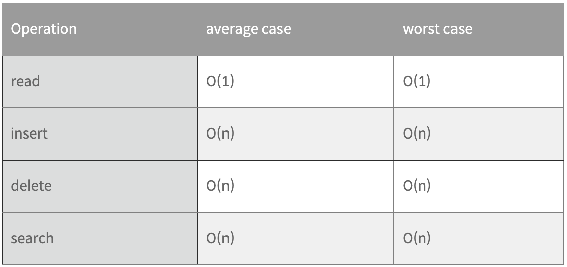 배열에서 요소를 삽입하거나 삭제하는 것은 복잡하며 비효율적입니다. 배열 중간에 요소를 삽입하거나 삭제하면 모든 뒤따라오는 요소들의 인덱스를 조정해야 합니다.