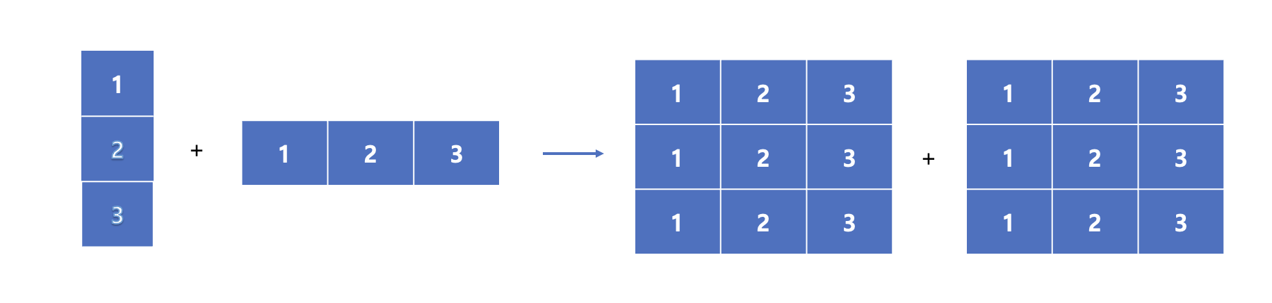 위와 같은 shape이 (3,1)(1,3) 연산에서는 1인쪽이 더 큰 3쪽으로 broadcasting되는 모습을 볼 수 있습니다. 따라서, 차원 크기가 다르더라도 1이라면 Broadcasting이 가능합니다!