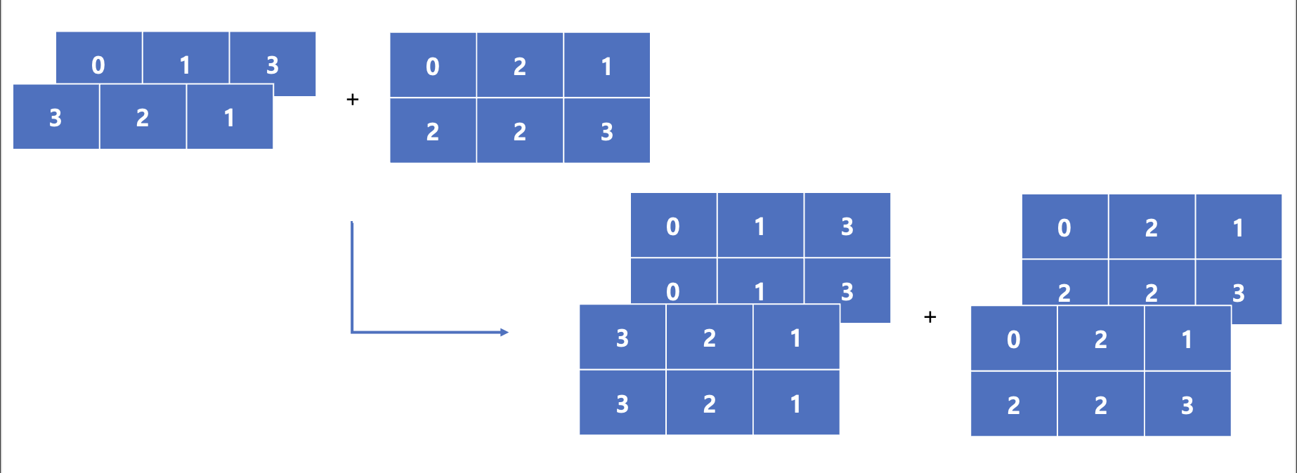 A는 3차원, B는 2차원의 Array입니다. 일단 차원이 안 맞지만 결론적으로 연산 수행은 가능합니다. 그럼 Broadcasting이 일어나는 과정을 살펴보겠습니다.