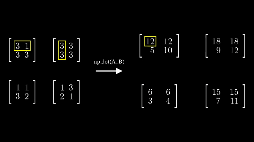 (a1a2a3)(b1b2b3)(a1a2a3)(b1b2b3)a1×b1+a2×b2+a3×b3\begin{pmatrix}a_1&a_2&a_3 \end{pmatrix} \cdot \begin{pmatrix}b_1&b_2&b_3 \end{pmatrix} \to \begin{pmatrix}a_1&a_2&a_3 \end{pmatrix} \cdot \begin{pmatrix}b_1\\b_2\\b_3 \end{pmatrix} \to a_1\times b_1 + a_2\times b_2 + a_3\times b_3