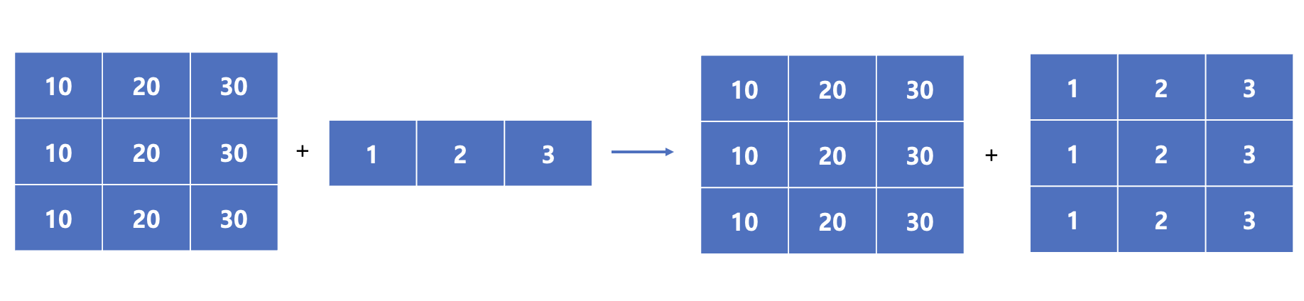 여기서부턴 3차원 이상의, Tensor-matrixTensor-Tensor사이 Broadcasting에 대해 생각해볼 수 있습니다.