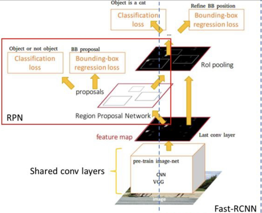 - RPN(Region Proposal Network)을 통해 selective search가 하는 일을 대신한다. 즉, 후보 영역을 여기서 산정을 하게 된다.