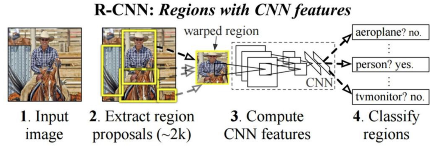 입력 이미지가 주어지면, region proposal을 수행(후보 영역을 찾음)하는데, 이는 selective search 방식을 통해 region proposal을 제시한다.