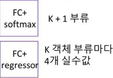 - 이를 통해 마지막 출력으로 두개의 FC(Fully connected layer)에서 클래스 부류출력(-> softmax)과 BBox위치값(regressor)의 추정값을 얻어낸다.