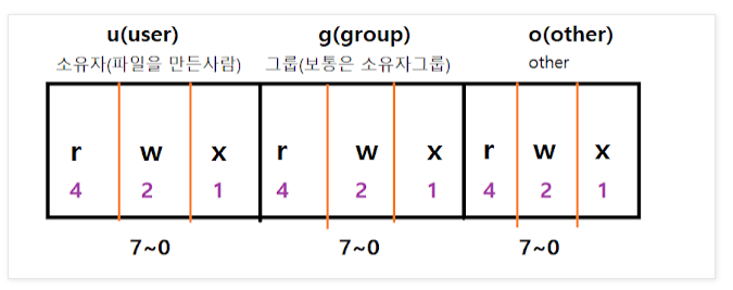 예를 들면 chmod 773 (u에 rwx, g에 rws , o에 wx)[파일]<-이 파일에 권한 부여