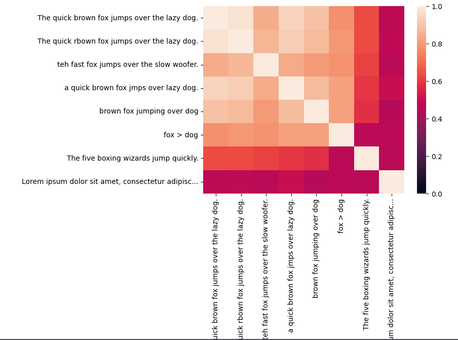 import pandas as pd import seaborn as sns df = pd.DataFrame(response['embedding'], index=truncated_texts) sim = df @ df.T sns.heatmap(sim, vmin=0, vmax=1);