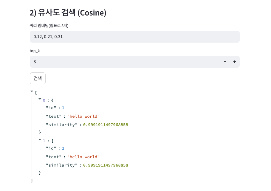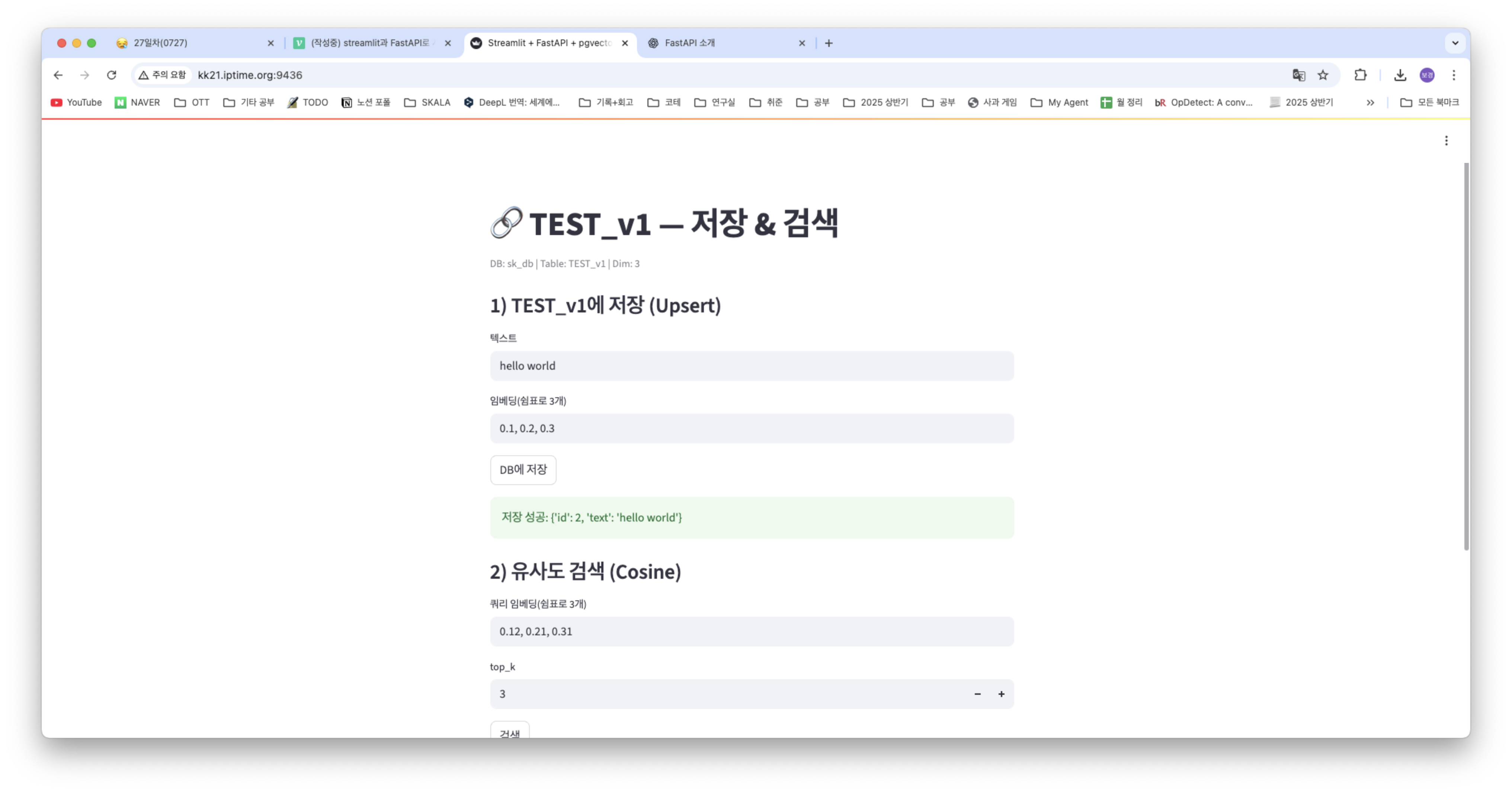 import os, json, requests, streamlit as st API_URL = os.getenv("API_URL", "http://localhost:8000") st.set_page_config(page_title="Streamlit + FastAPI + pgvector (TEST_v1)", layout="centered") st.title("🔗 TEST_v1 — 저장 & 검색") # 서버 메타 가져와서 차원/테이블 확인 try: meta = requests.get(f"{API_URL}/meta", timeout=10).json() DIM = int(meta.get("dim", 3)) TABLE = meta.get("table", "TEST_v1") st.caption(f"DB: {meta.get('db')} | Table: {TABLE} | Dim: {DIM}") except Exception as e: DIM = int(os.getenv("VEC_DIM", "3")) TABLE = "TEST_v1" st.warning(f"메타 조회 실패. Dim={DIM}로 가정. ({e})") # --- 저장 --- st.subheader("1) TEST_v1에 저장 (Upsert)") text = st.text_input("텍스트", value="hello world") emb_str = st.text_input(f"임베딩(쉼표로 {DIM}개)", value="0.1, 0.2, 0.3" if DIM==3 else "") if st.button("DB에 저장"): try: emb = [float(x.strip()) for x in emb_str.split(",") if x.strip() != ""] if len(emb) != DIM: st.error(f"임베딩 길이는 {DIM} 이어야 합니다. (현재 {len(emb)})") else: r = requests.post(f"{API_URL}/upsert", json={"text": text, "embedding": emb}, timeout=30) r.raise_for_status() st.success(f"저장 성공: {r.json()}") except Exception as e: st.error(f"실패: {e}") # --- 검색 --- st.subheader("2) 유사도 검색 (Cosine)") q_str = st.text_input(f"쿼리 임베딩(쉼표로 {DIM}개)", value="0.12, 0.21, 0.31" if DIM==3 else "") top_k = st.number_input("top_k", min_value=1, max_value=100, value=3, step=1) if st.button("검색"): try: q = [float(x.strip()) for x in q_str.split(",") if x.strip() != ""] if len(q) != DIM: st.error(f"임베딩 길이는 {DIM} 이어야 합니다. (현재 {len(q)})") else: r = requests.post(f"{API_URL}/search", json={"embedding": q, "top_k": int(top_k)}, timeout=30) r.raise_for_status() st.write(r.json()) except Exception as e: st.error(f"실패: {e}") # --- 최근 N건 보기 --- st.subheader("3) 최근 레코드") try: lst = requests.get(f"{API_URL}/list", timeout=10, params={"limit": 10}).json() st.table(lst) except Exception as e: st.info(f"최근 레코드 조회 실패: {e}")