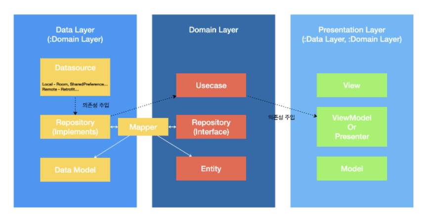 Domain Layer의 UseCase를 직접 주입하여 비즈니스 모델을 만든다.> 도메인 계층에 대한 의존성을 가지고 있다는 의미이며, 의존성 주입은 DI 툴인 Hilt Dagger2 를 사용하여 주입하는 형태로 만들어진다.Repository를 실제로 구현할 수 있다.DataSource를 다루게 되고 이로인해 안드로이드에 대해 의존성이 생긴다.Mapper를 두어 DB에서의 데이터모델과 UI에 맞는 데이터 모델을 매핑해준다.앱에서 일어날 동작인 비지니스 로직을 포함하며, Entity와 UseCase를 포함한다.