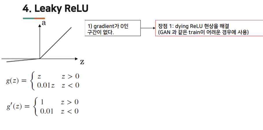 - ReLU/Leaky ReLU : Leaky ReLU에서는 선형적인 모습이 더 많이 보이기도 함. 그러나 ReLU의 다잉 ReLU를 피하기 위해 Leaky ReLU를 쓰기도 한다.