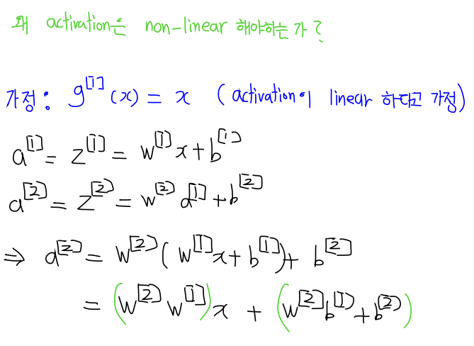- linear activation을 사용한다면 layer를 무수히 쌓아도 결과는 linear 하게 되는 것.