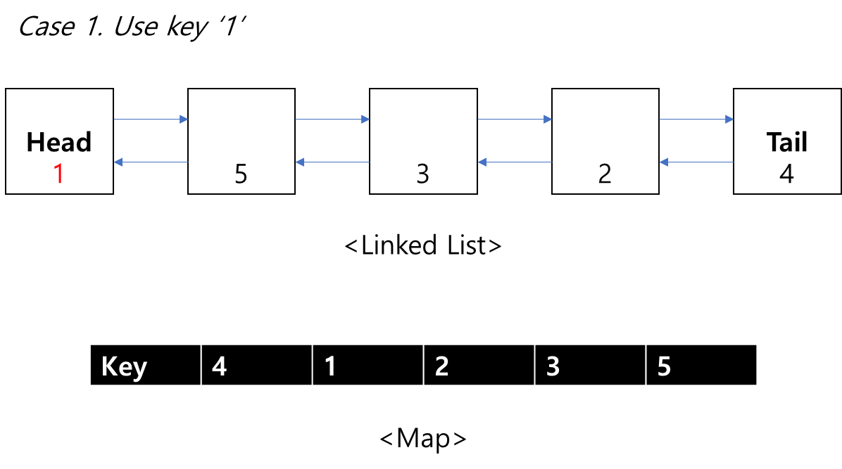 따라서 연결 리스트에서 key '1'의 노드가 맨 앞으로 옮겨지고, Map 에서는 아무런 동작을 하지 않습니다.