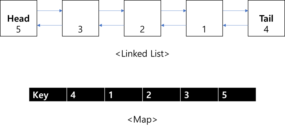 정리하자면, mp 를 이용하여 캐시 저장소를 관리하고, 연결 리스트는 사용한 key 들의 순서를 저장하는 용도입니다.