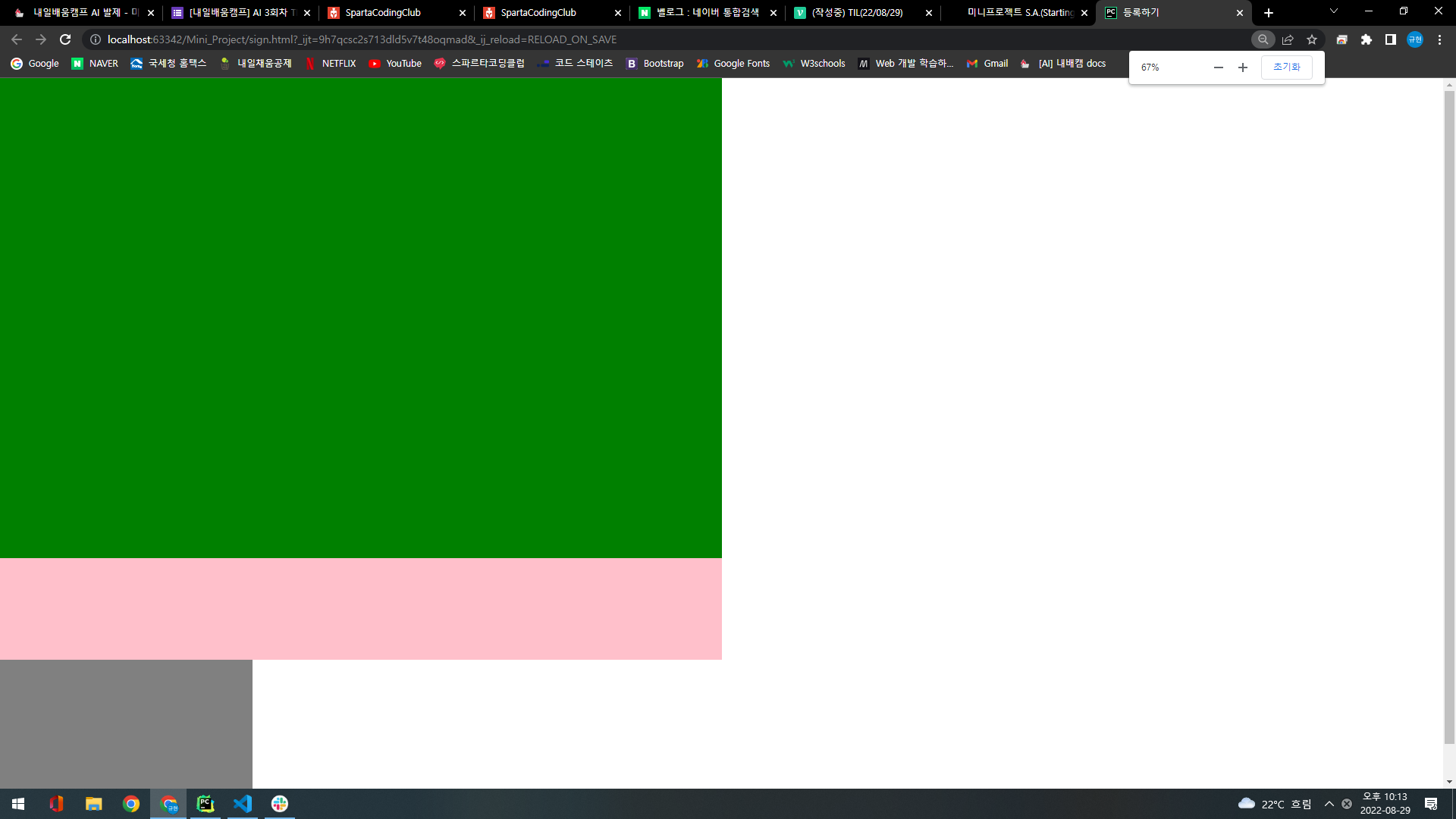 레이아웃을 하기 위해 기본적인 틀만 그리고, css로 색을 입혔는데 나는 width를 50%씩 주었기 때문에 스크린이 좌우 반반으로 그려질 줄 알았다 하지만 결과는 수직으로 쌓여갔다.