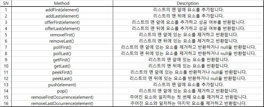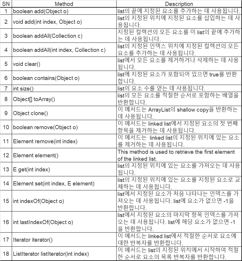 LinkedList의 메서드는 아래 표에 나열되어 있습니다