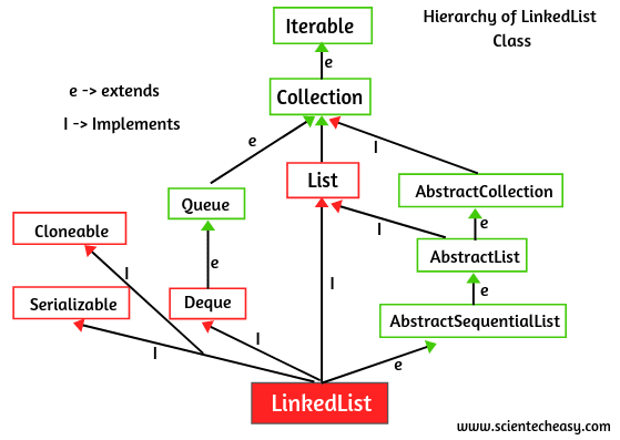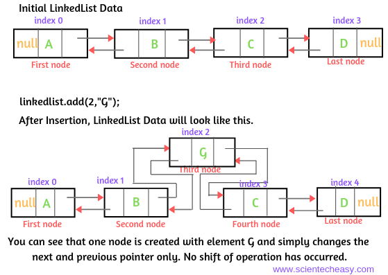 이로써, LinkedList는 요소의 재배치를 필요로 하지 않지만 각 요소가 링크에 의해 다음과 이전 요소와 연결되어야 한다는 점이 필요합니다.