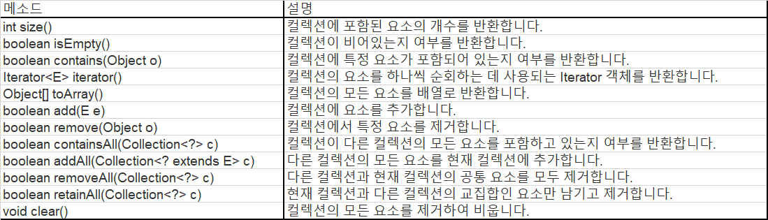 1 . addAll(Collection<? extends E> c) : 주어진 컬렉션 c의 모든 요소를 현재 컬렉션에 추가합니다.