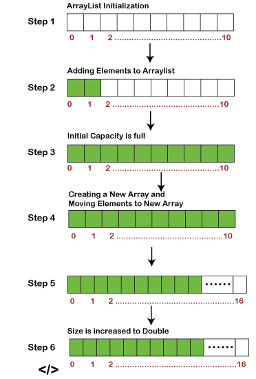 요소가 추가될 때마다 크기가 증가하며, 초기 용량은 0입니다. 요소가 제거되면 크기가 자동으로 줄어듭니다.